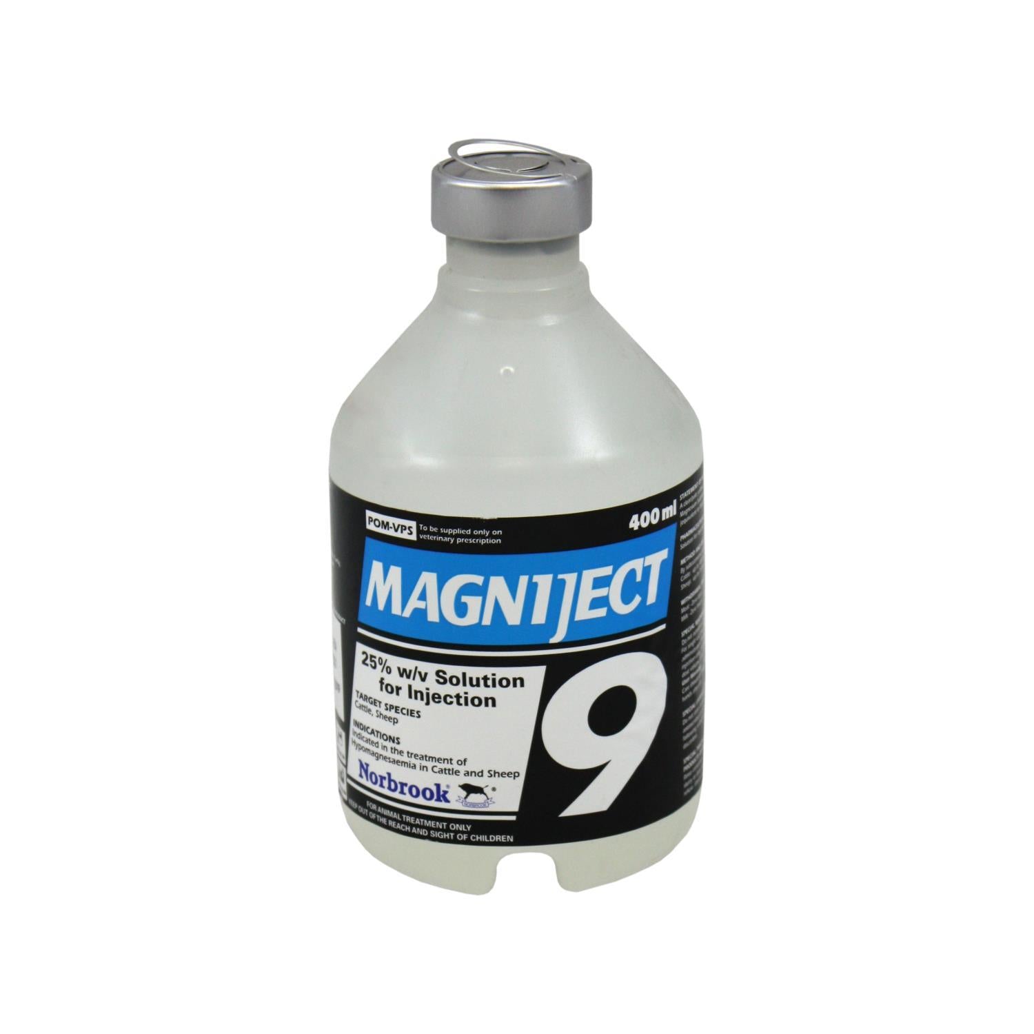 equivalent to Magnesium Sulphate anhydrous 12.21% w/v. Magniject is indicated in the treatment of hypomagnesaemia in cattle and sheep.
